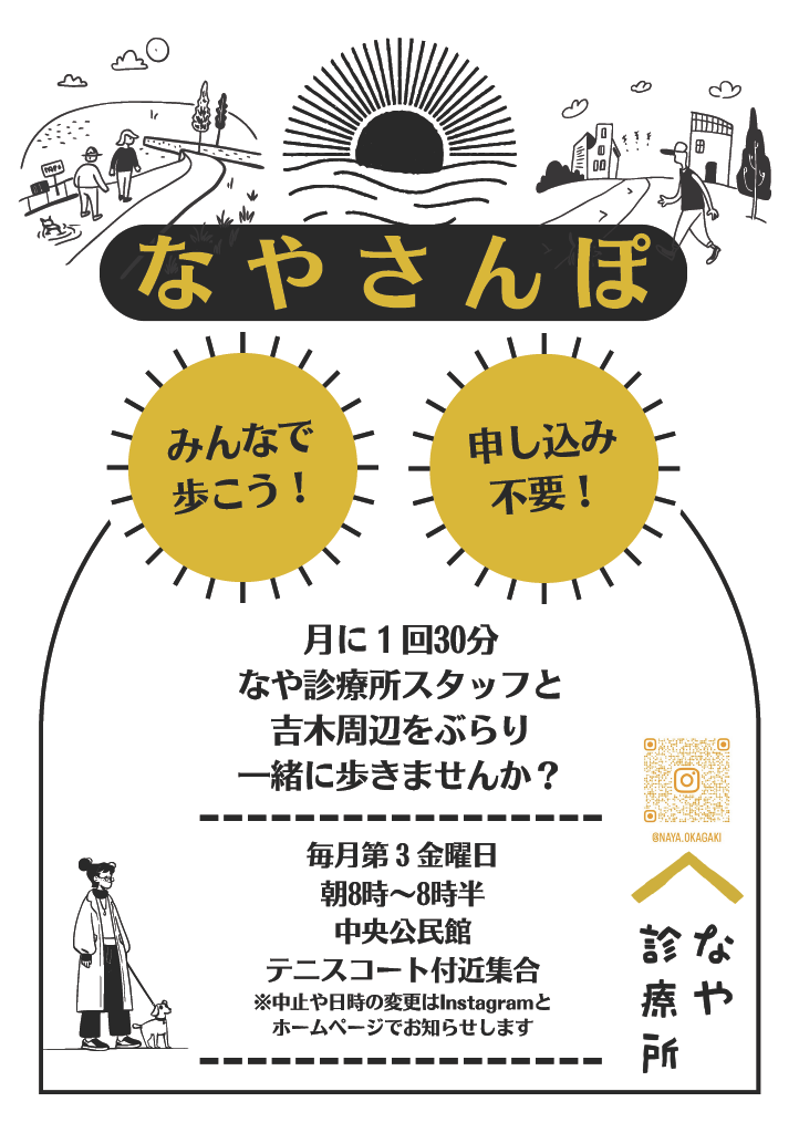 2025.12.03 お知らせ 『なやさんぽ』始まります! Writen by 秋田 寛子 月に一回、なや診療所のスタッフと一緒に、岡垣町吉木をぶらっとお散歩しませんか?申し込み&参加費不要。その日の気分でどなたでもご参加いただけます。 毎月第3金曜日。朝8時に、岡垣町中央公民館のテニスコート付近に集合したいと思います。 30分程度のお散歩です。ゆっくり歩きでも、スタスタ早歩きでも、車椅子でも、ベビーカーでも、なんとな〜くみんなで集まって、ゆる〜くお散歩しましょう♪ ※天候等諸事情で中止や変更となる場合は、ホームページとInstagramでお知らせします。 Instagramはここ