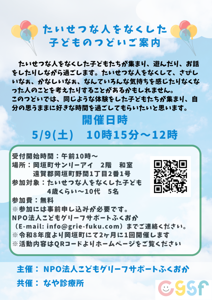 ○申し込み先:info@grie-fuku.com (NPO法人こどもグリーフサポートふくおか)